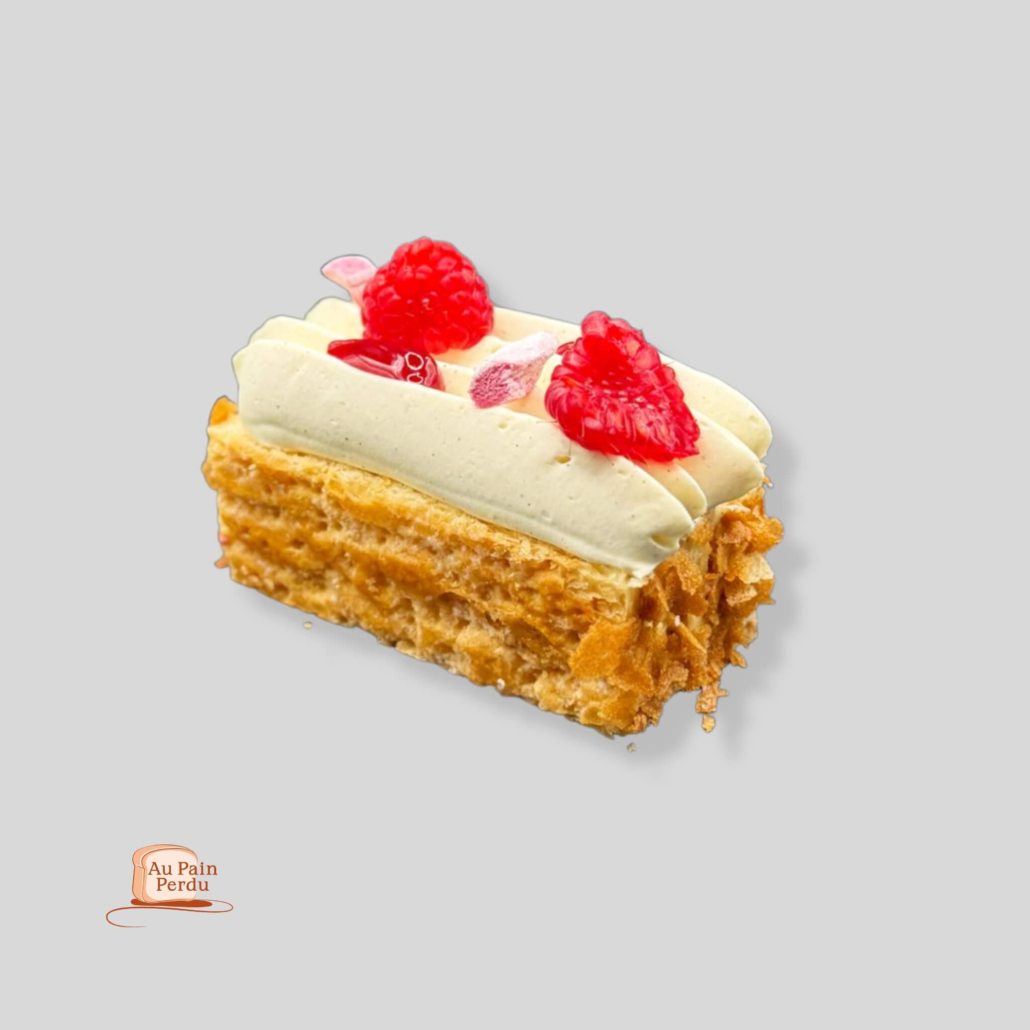 Fond feuilleté caramel, crème vanille, confiture de framboises, framboises entières et chantilly vanille
