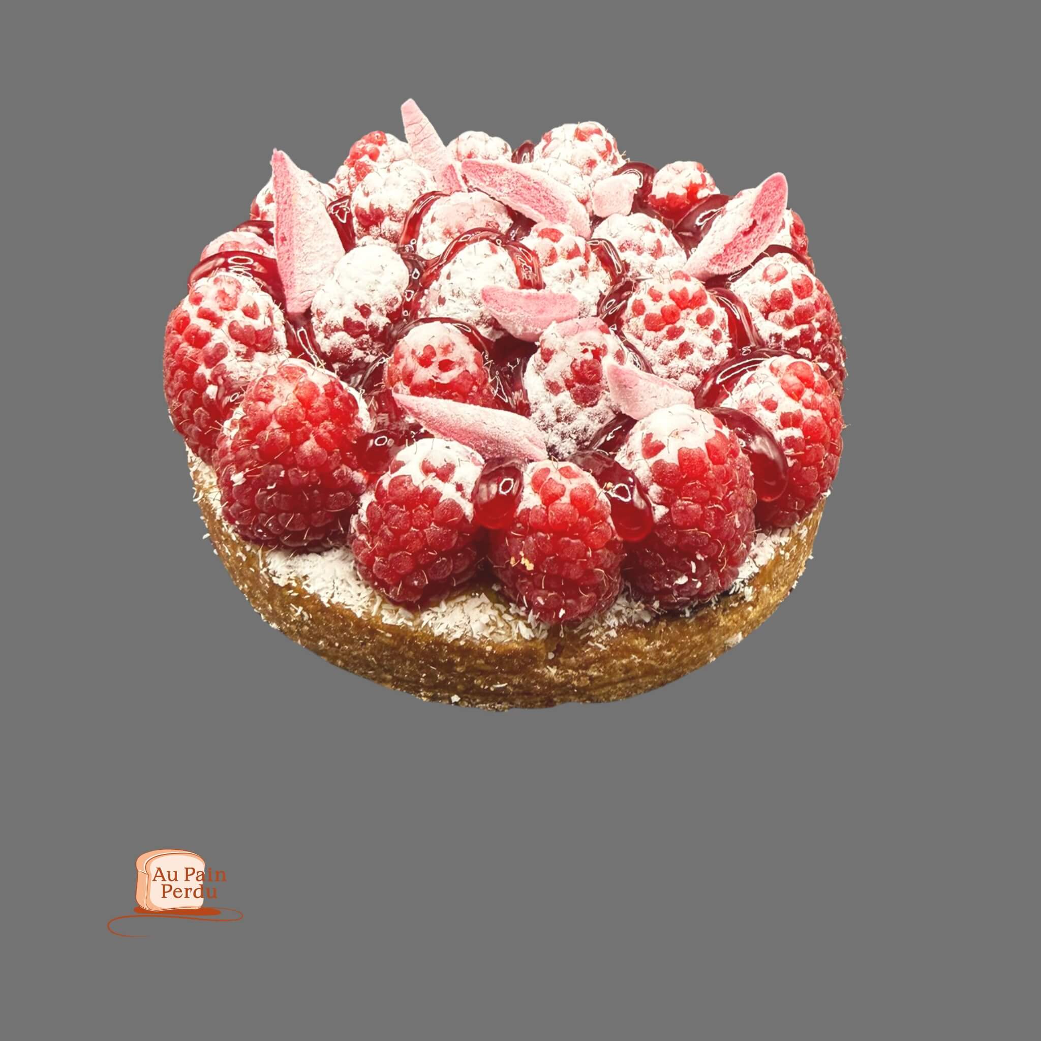 Fond de pâte sucré, crème d'amandes framboises, crémeux à la mangue et framboises avec chantilly